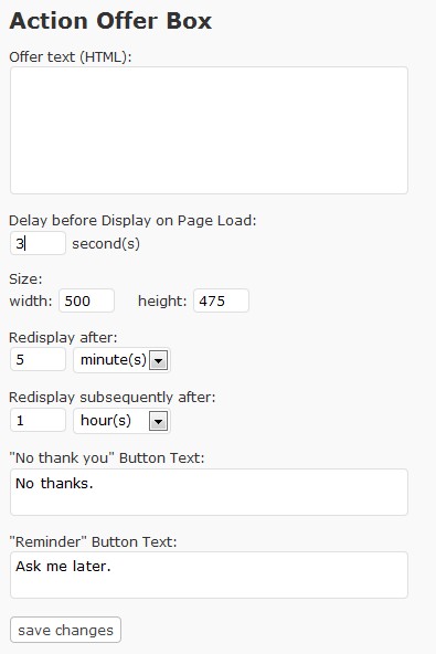 With Action Offer Box plugin, you can have a choice of putting anything on your pop up message. It is not meant to use just for list building to put your autoresponder code in your pop up.