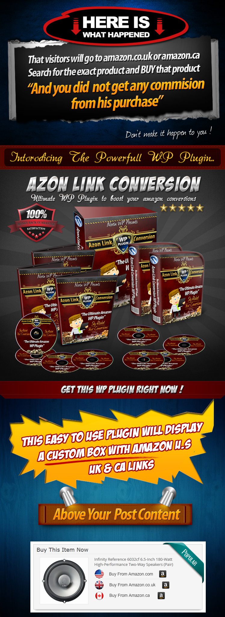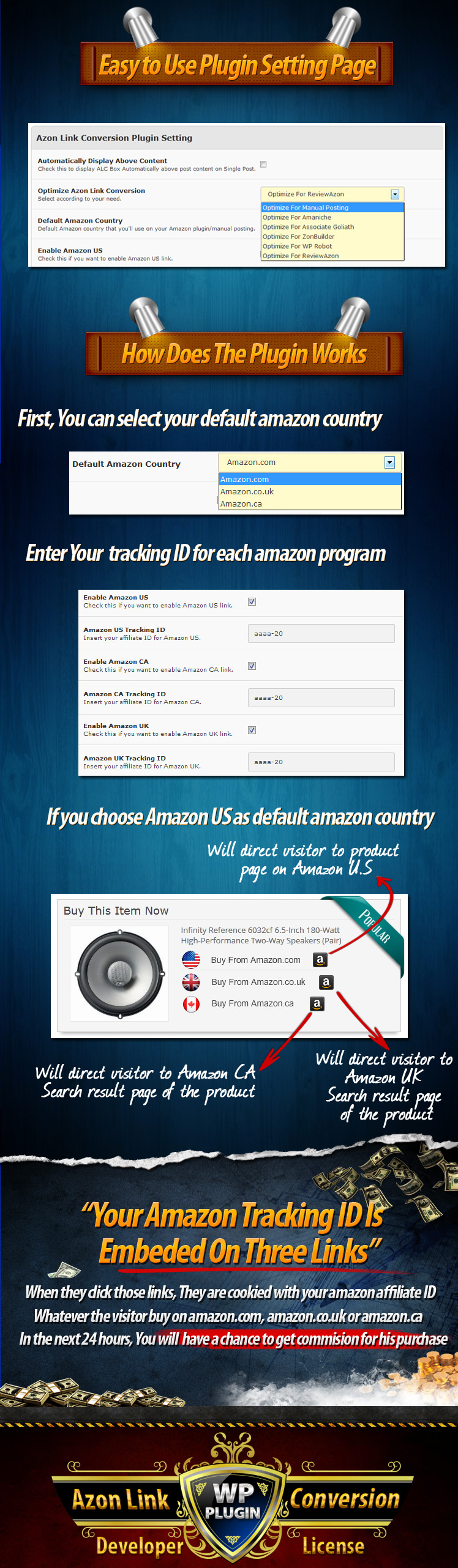 Best regards, NOTE 1 : Your theme must have a Single Post page with minimum 540px width. Because AzonLinkConversion (ALC) will display a box with width size 540px. NOTE 2 : AzonLinkConversion (ALC) plugin is compatible with Manual Posting and 5 Amazon Autoposting Plugins : Associate Goliath, Amaniche, ReviewAzon, ZonBuilder & WP Robot*. * There is a special setting for your WP Robot campaign in order for ALC to compatible with WP Robot, your current Campaign settings might not meets the requirement that ALC needs. We cover about this on the Plugin Documentation page here. Hosting Requirement: Developer License Terms: FAQs & SupportNeed Help? Contact Our Support Desk: http://kenhelpdesk.com Can I Hide The Ribbon? Yes, you can select to hide the ribbon. And you can select 1 ribbon only or randomize all ribbons (there are 6 ribbons available). What If I Have Some Posts That Are A Standard Article/Blogpost? The plugin will only display the box on your product post. It will not display anything if your post is not promoting any Amazon products Yes, if you do manual posting. You can use this shortcode, place it anywhere on post editor: [azonlinkconversion] I Choose Amazon US As Default Country, When I Click Buy On Amazon CA, It Returns No Result. Yes, product name in Amazon US may differs on Amazon UK & Amazon CA.