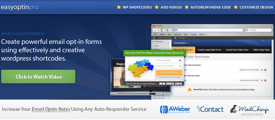 Install the easy optin plugin in only seconds. Choose the type of email optin form you would like to create, add your auto responder code, customize the design and content, add your image or video and click save. Show your custom email shortcode on any blog post or sidebar with a simple shortcode. Create one for all pages, or create a new shortcode for each page.