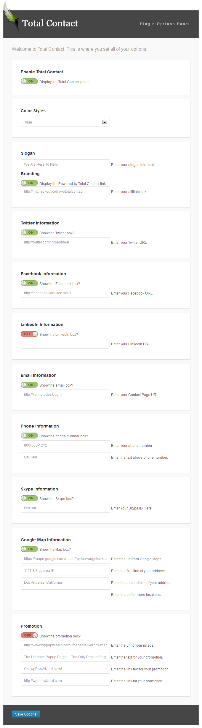 It is very easy to use! Simply Click the ON and OFF switch! Here is a screenshot of wpTotalContact: